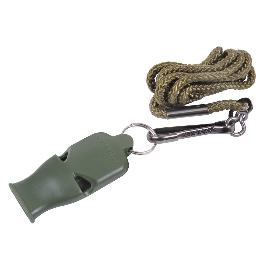 Rothco No Ball Safety Whistle includes a split key ring, 19" lanyard, and clip.