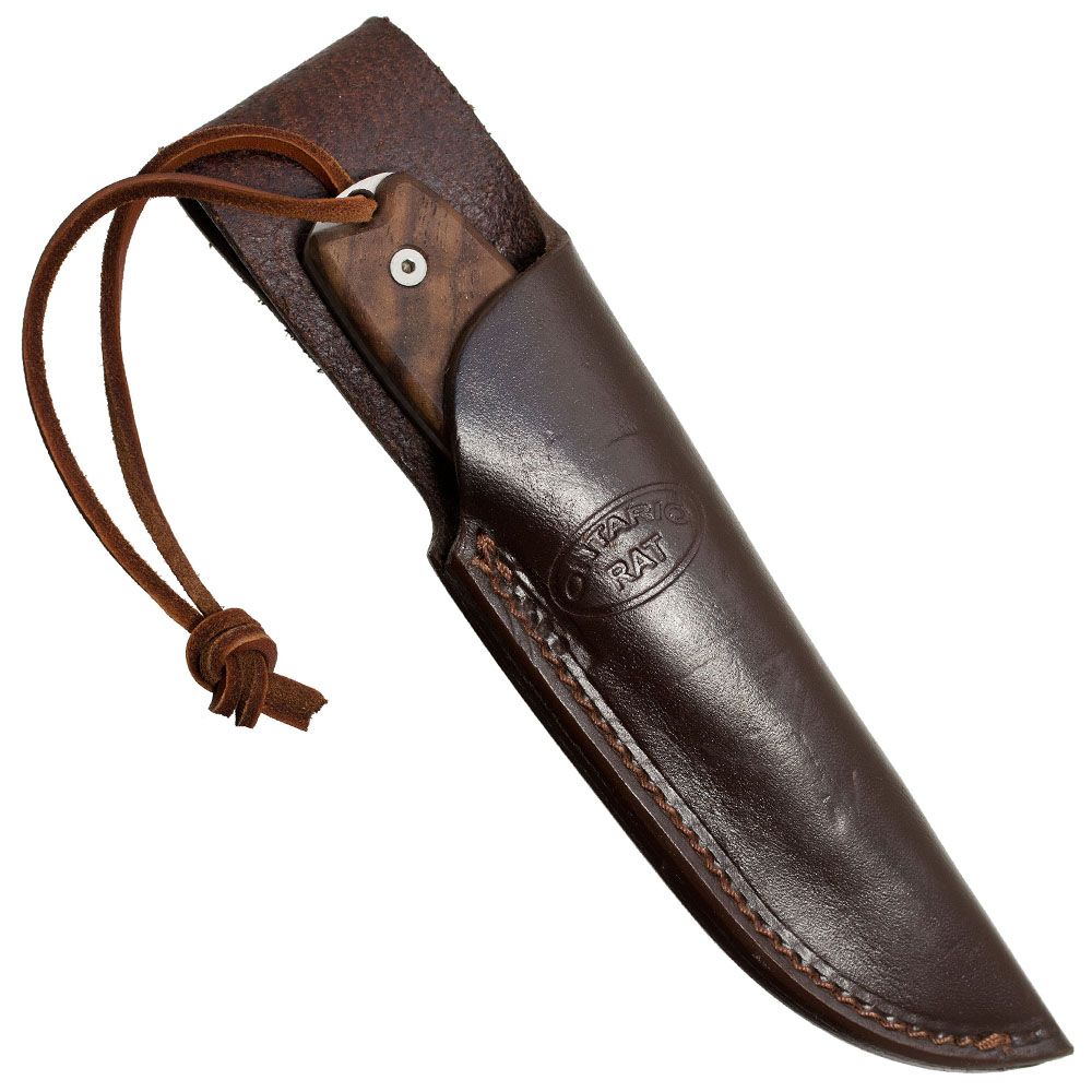 This OKC Limited Edition RAT-3 Hunter Knife combines modern beauty with old fashioned build materials. Its D2 tool steel blade has a shiny satin finish and holds up with great edge retention. The classic hardwood handle creates a unified hunting look when placed into its durable leather sheath.