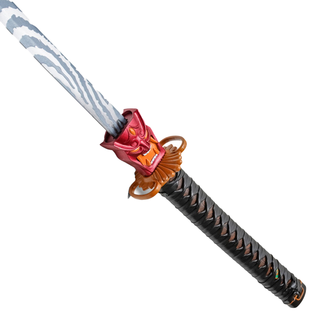 The Oni 39.5-inch Patterned Katana stands out with its detailed steel blade and bold handle design. A 25.5-inch blade showcases a striking pattern, while the 14-inch handle, wrapped in black and red, delivers a commanding grip.