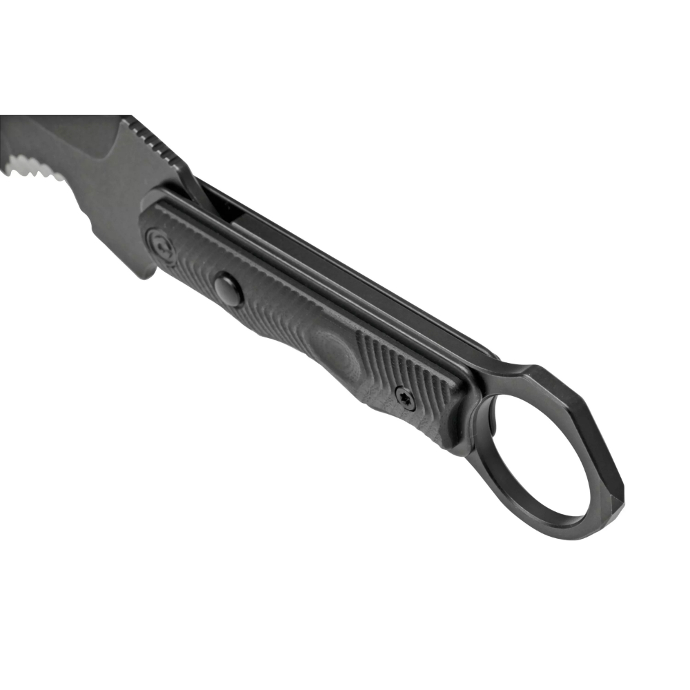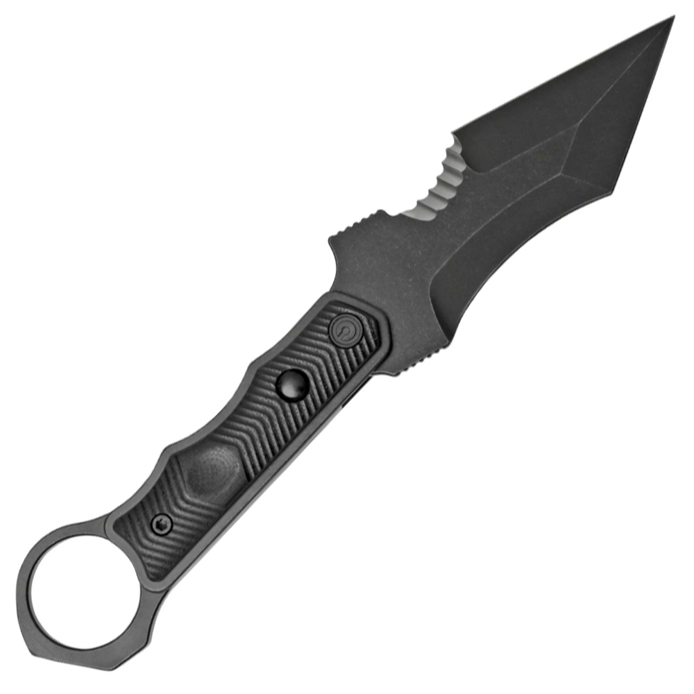 To put it mildly, the Orthrus is an intriguing knife. A knife that combines elements of a boot knife, combat dagger, and karambit to create one that elevates military aesthetics. As soon as you take it in your hands, you'll see how well-designed the handle is, with finger grooves, a guard, and a ramp for your thumb to keep you from sliding forward. The pinky ring may also be used for heavy-duty prying and is primarily for indexing the knife in a reverse grip. This is a fantastic, adaptable design that can be quite lethal in the proper hands.