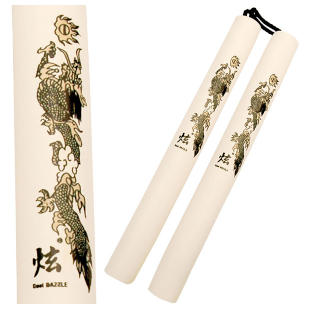 Introducing the Chinese Foam Nunchaku, a martial arts training tool designed for both beginners and experienced practitioners. This nunchaku features a 12" overall length, with each handle padded in black foam for comfortable grip and connected by a durable nylon cord. The nunchaku is adorned with a striking dragon graphic, adding a touch of traditional style to your training.