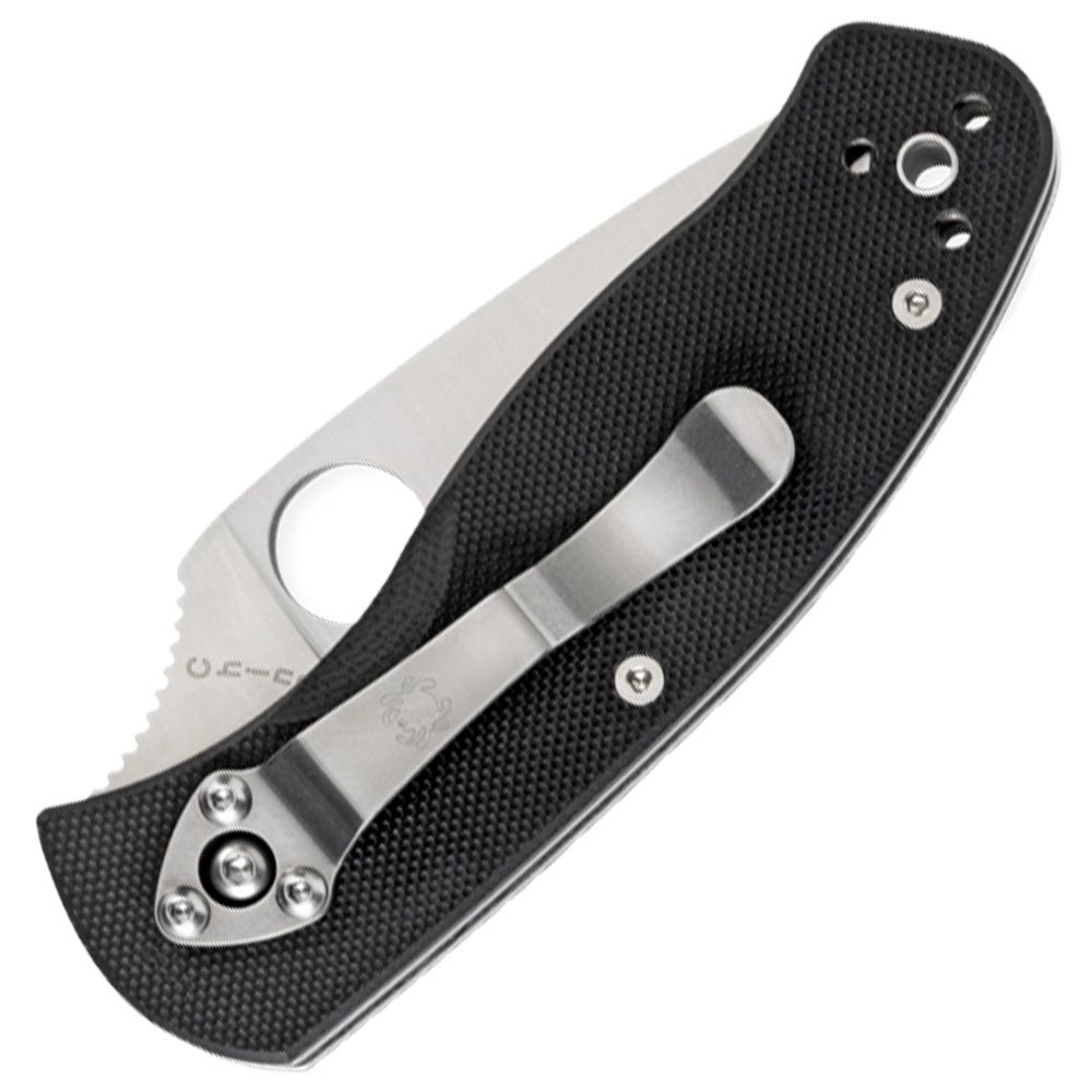 Skeletonized steel liners tucked inside the handle, increase the handle's rigidity and strength level without adding non-functional weight or bulkiness. The 8Cr13MoV stainless blade is a modified skinning-style, ground-flat. Careful positioning of the oversized Spyderco Round Hole, relative to the location of the pivot, pre-set the hand in just the right spot for fumble-free one-hand blade open/close.