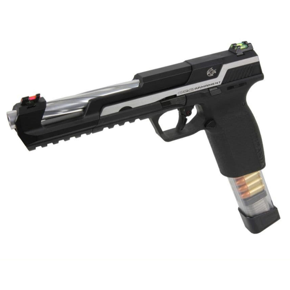 The Piranha SL Version is sure to please you with its price point while offering you plenty of rewarding features. It combines a very advanced split slide and an interesting muzzle adjustable hopup design to offer great accuracy and functionality right out of the box. The grip has also been enhanced to better fit your hand and included is also an additional back strap for better fitment. The slide gives a nice metallic sound when operating guaranteed to make your enemy quake in their boots.