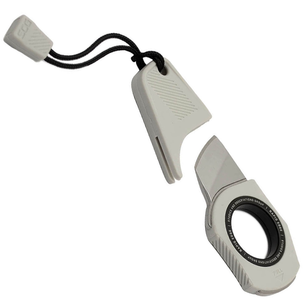 Rapid Edge features a compact blade. Stored on a keychain or lanyard loop, Rapid is quickly and easily deployed and flies under the radar when not in use. The design of the handgrip intuitively guides your fingers into the optimal position when deployed, providing a secure grip to get to work. Rapid is quick to deploy from the sheath with a simple tug and is easily controlled with one finger through the index finger hole. Made with a full tang tool design, aluminum pull-ring and textured GRN grip and sheath.