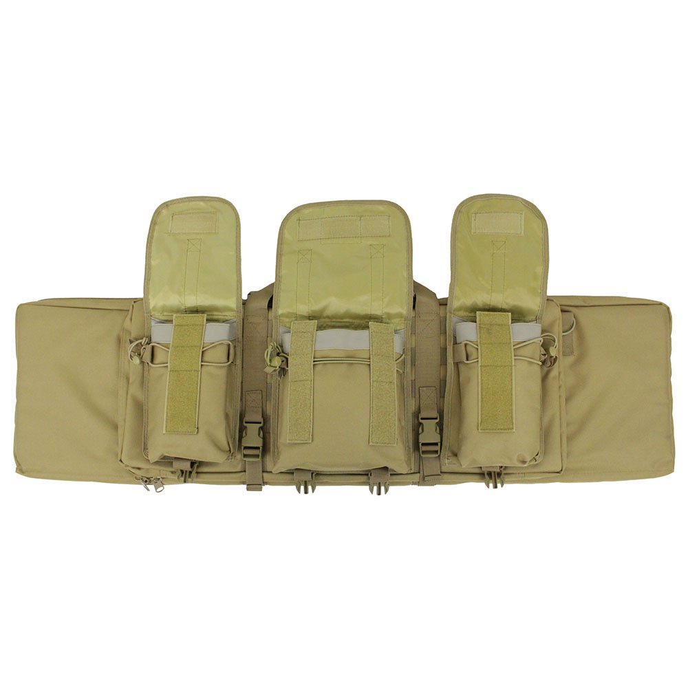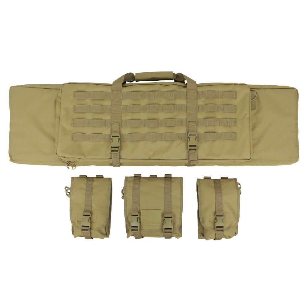 Take the hassle out of weapons transportation with this Raven X MOLLE Carbine Case. The main compartment is shielded with a thick wall of padding and lined with hook and loop straps and retention pockets to secure any rifle up to 42” in length. The front pocket has two tight sleeves for sidearms like pistols or SMGs. The front MOLLE panel comes equipped with three modular pouches for additional gear. Measures 43-inches x 13-inches x 3-inches.