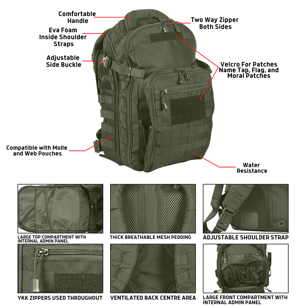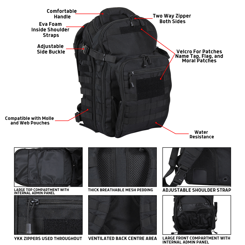 The Raven X Tactical Utility Backpack is built for durability and versatility, designed to handle rugged outdoor conditions and tactical use. Featuring a water-resistant build, it comes equipped with a MOLLE-compatible system for modular attachments, a spacious main compartment, and multiple zippered pockets for organized storage. The adjustable shoulder straps and ventilated back panel ensure comfortable wear, while the heavy-duty YKK zippers provide long-lasting performance. Whether for military, law enforcement, or outdoor adventures, this backpack delivers the reliability you need.
