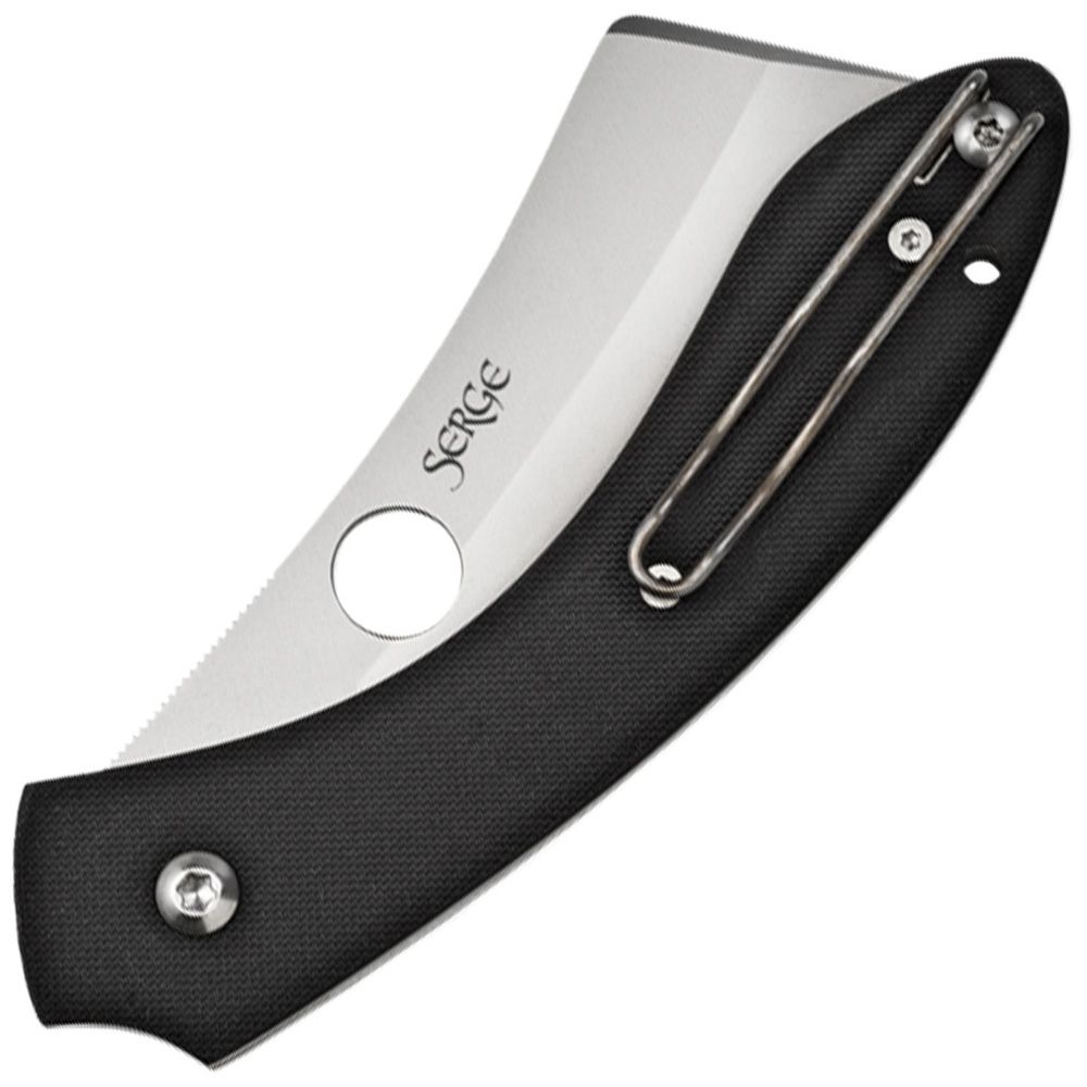 Designed by custom knifemaker Serge Panchenko, the Roc combines an unusual cleaver-style blade with a gracefully curved handle and a sturdy Liner Lock mechanism to create a uniquely functional cutting tool that challenges convention. Precision ground from VG-10 stainless steel, the Roc’s blunt-tipped, Plain Edge blade features a low-profile matte gray finish and a saber grind that balances high-performance edge geometry with the strength and heft of a full-thickness spine. A long section of jimping (textured grooves) on the blade’s spine provides a solid purchase for the user’s thumb, and an easily accessible Trademark Round Hole ensures swift, positive one-handed opening with either hand.
