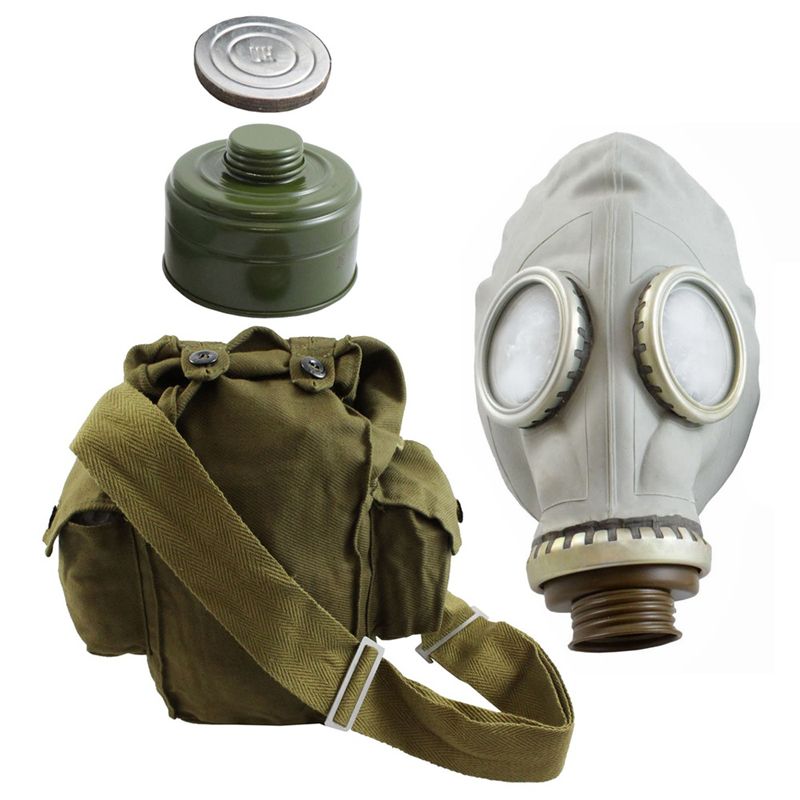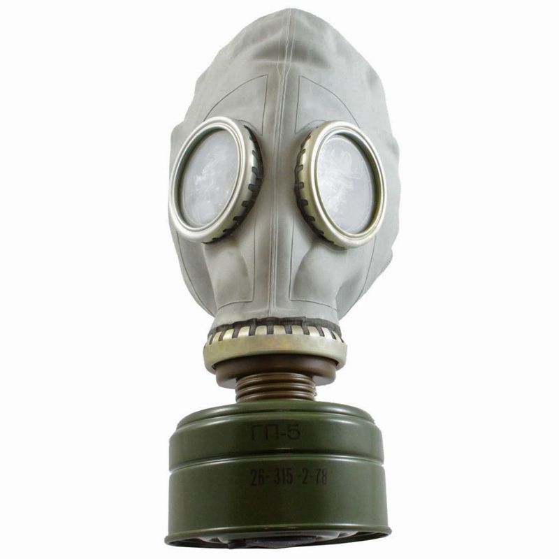 The GP-5 is a Soviet-manufactured gas mask, designed during the Cold War to protect civilians from nuclear fallout. It features the single-filter, sealed glass-eye SHM-62u face piece. The rubber shell stretches to form a tight seal around the users head to protect against radioactive, biological, and chemical agents. This package includes the original pieces distributed to fallout shelters from 1962 - 1989: a face piece, filter, anti-fogging lens inserts, and an oliver drab carrying bag.