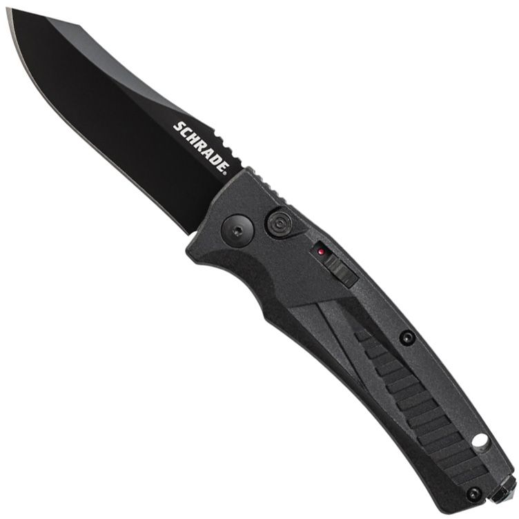 Schrade Push Button Lock Folding Knife, Black AUS-8 High Carbon Stainless Steel Clip Point Blade with Thumb Ramp Jimping, Coarse & Textured Black Aluminum Handle with Safety Lock, Lanyard Hole, Glass Breaker, and Reversible Pocket Clip