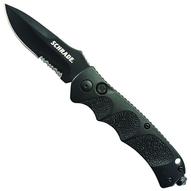 Schrade Black Drop Point 40 Percent Serrated 4116 Steel Push Button Lock