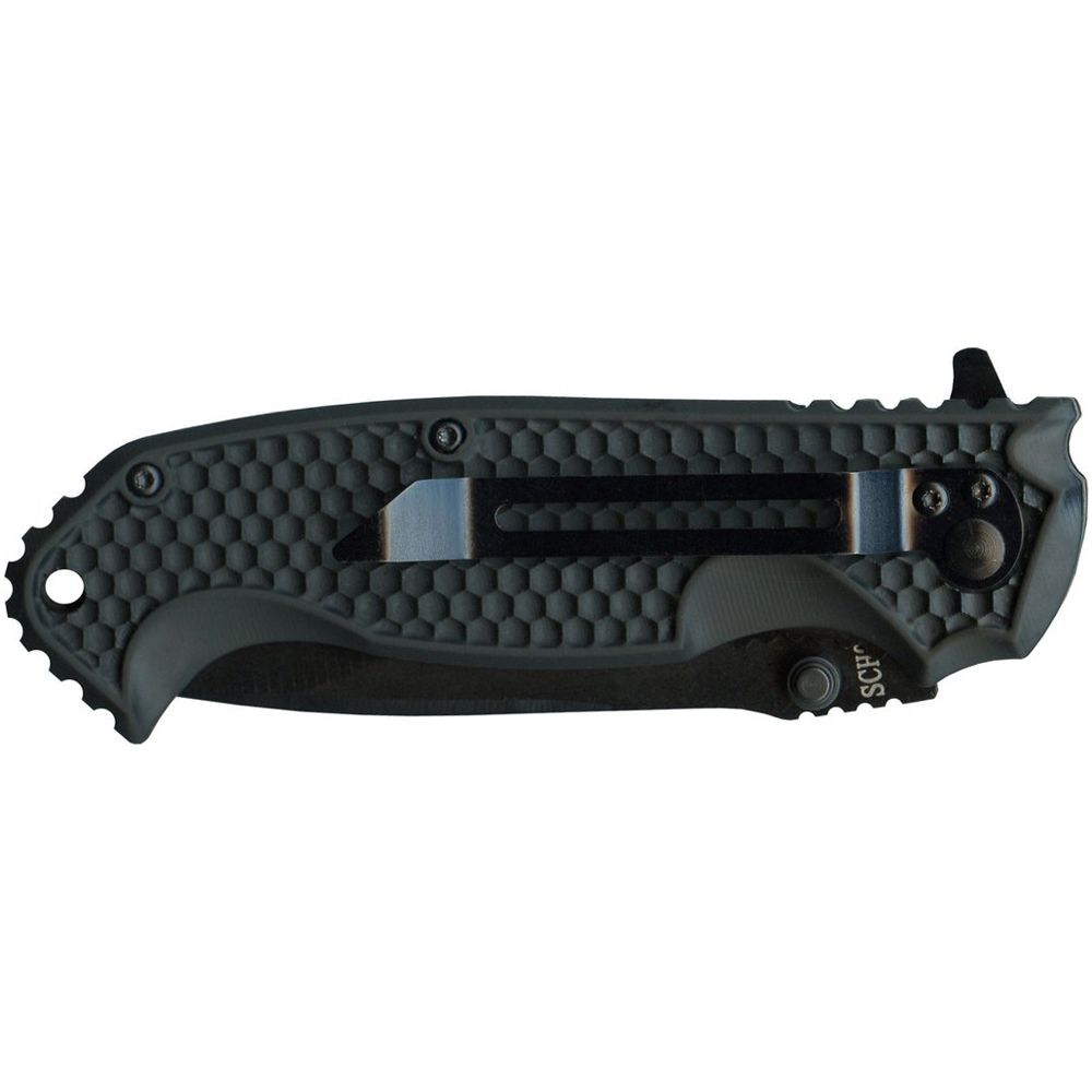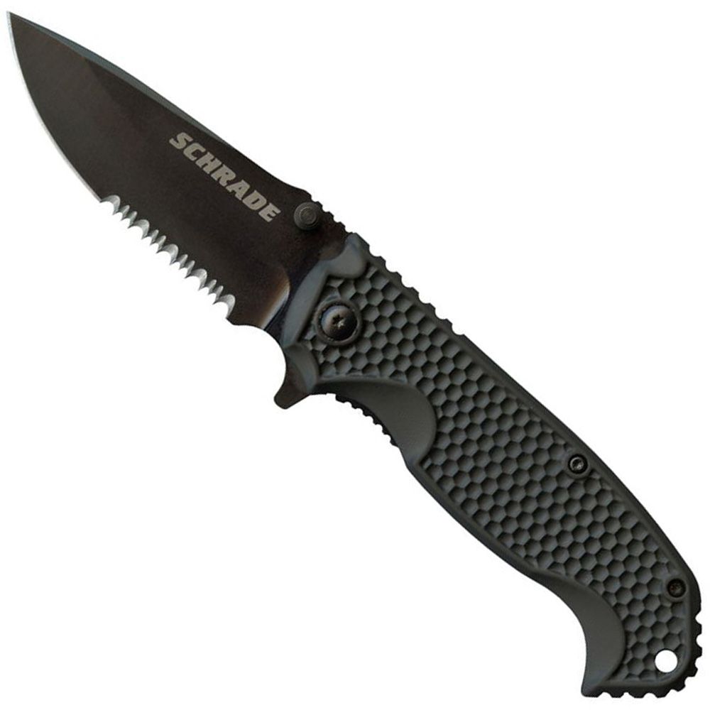 The Schrade 001 knives are tactically built utility folders with both style and function. The handle is a comfortably contoured zytel with dimpling and jimping for a secure hold in multiple grips. The thumb studs work equally as well as the flipper and the index finger choil allows for fine detail work with the 3.3" drop point blade.