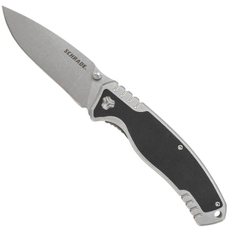 Schrade Ultra Glide Liner Lock Folding Knife, 9Cr18MoV High Carbon Stainless Steel Drop Point Blade with Ambidextrous Thumb Knobs and Thumb Rest, Stainless Steel Handle with G-10 Insert, Thumb Rest Jimping, Lanyard Hole, and Pocket Clip.