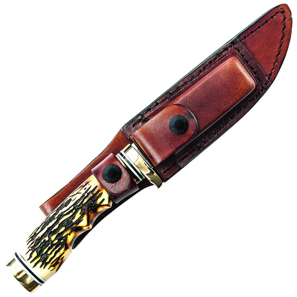 Uncle Henry Golden Spike Rat Tail Tang Fixed Blade Knife, 7Cr17MoV High Carbon Stainless Steel Clip Point Blade, Staglon Handle with Nickel Silver Guard and Pommel, and Brown Leather Belt Sheath with Sharpening Stone.