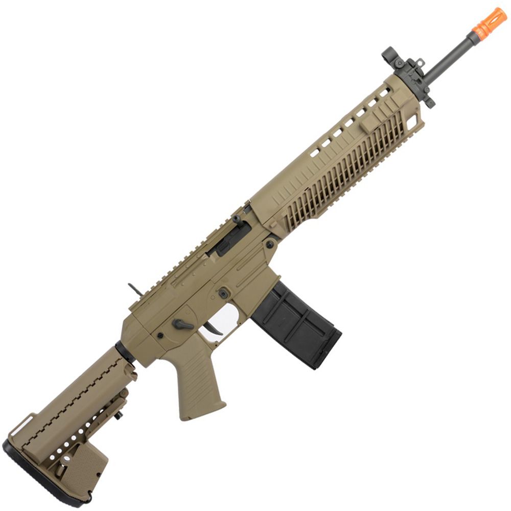 The Sig Sauer 556 is the perfect skirmishing weapon thanks to its midlength size, collapsible stock, and immense firepower. The adjustable hop-up system and lengthy interior barrel blasts through 400 round magazines at up to 400 FPS. The full metal body gives the gun durability and realism, while comfortable polymer grips provide easy handling.