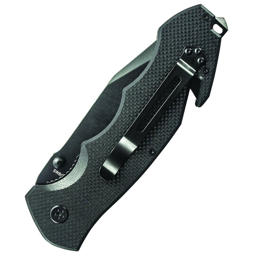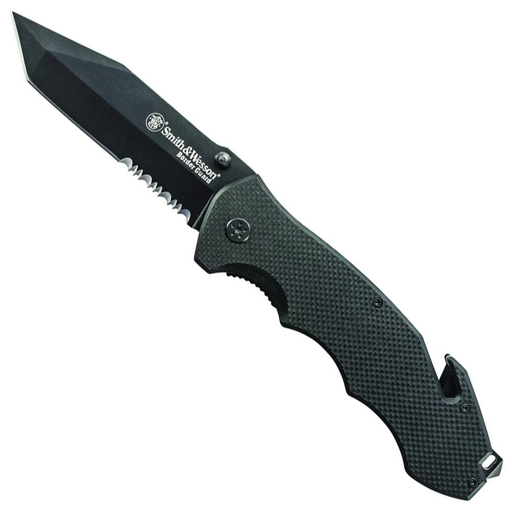 Smith & Wesson Border Guard Liner Lock Black Tanto Partially Serrated Blade with Ambidextrous Thumb Knobs G-10 Handle with Lanyard Hole, Glass Break, Strap Cutter, and Pocket Clip