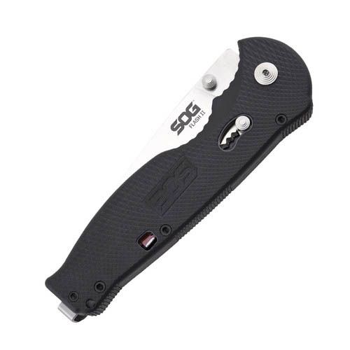The Flash family of knives feature SOG Assisted Technology (S.A.T.), which employs a powerful piston lock that is easily released with a sliding button. The Flash II comes standard with glass-reinforced nylon (GRN) handle and black TiNi 1/2 AUS-8 serrated blade, clip, and pivot. All Flash knives come standard with SOG's patent pending, reversible bayonet mounted clip that ensures the lowest, most discreet carry possible. We also had the foresight to incorporate an additional safety lock that gives added security when the blade is closed.