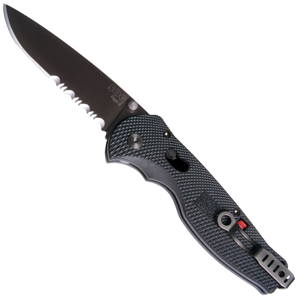 Sog STGFSA-98 Flash II - Aluminum Handle (Black TiNi Blade). The Flash II has got to be one of the coolest knives we’ve ever seen. Forget its wicked-quick blade access, that it handles like a race car on rails, or that it locks up like Alcatraz. It just l