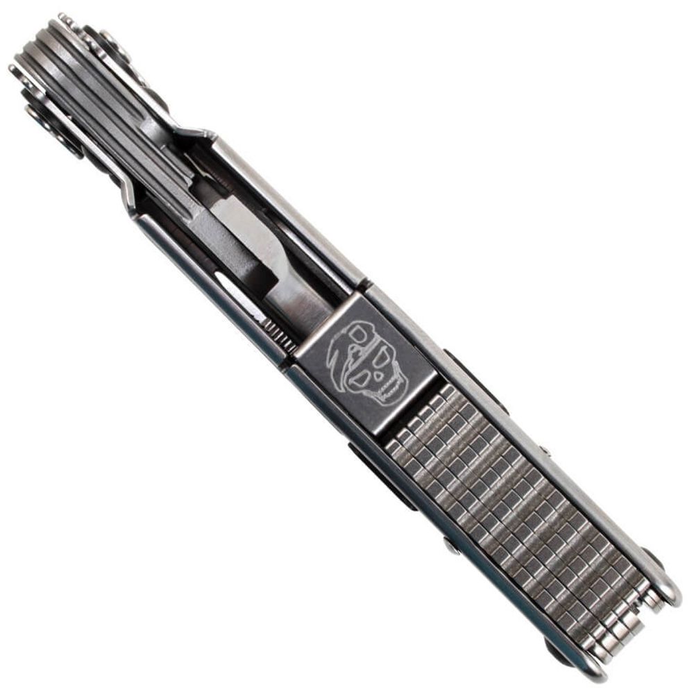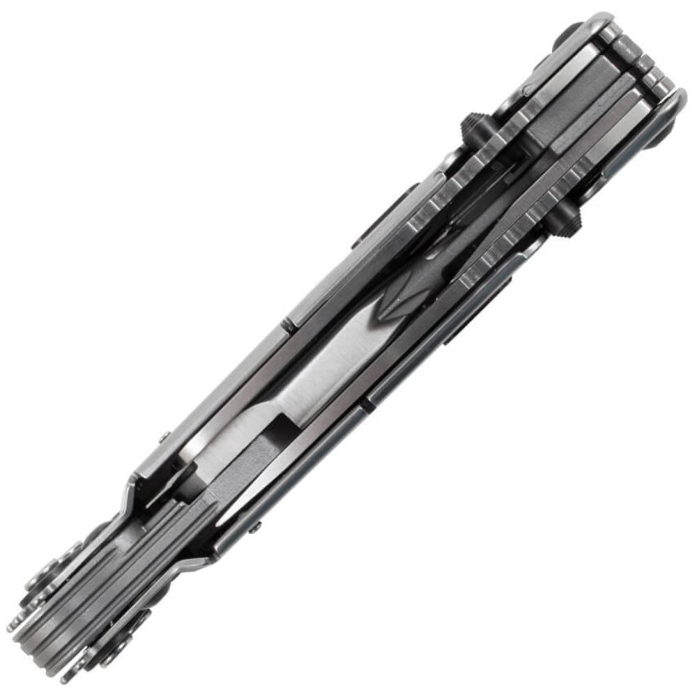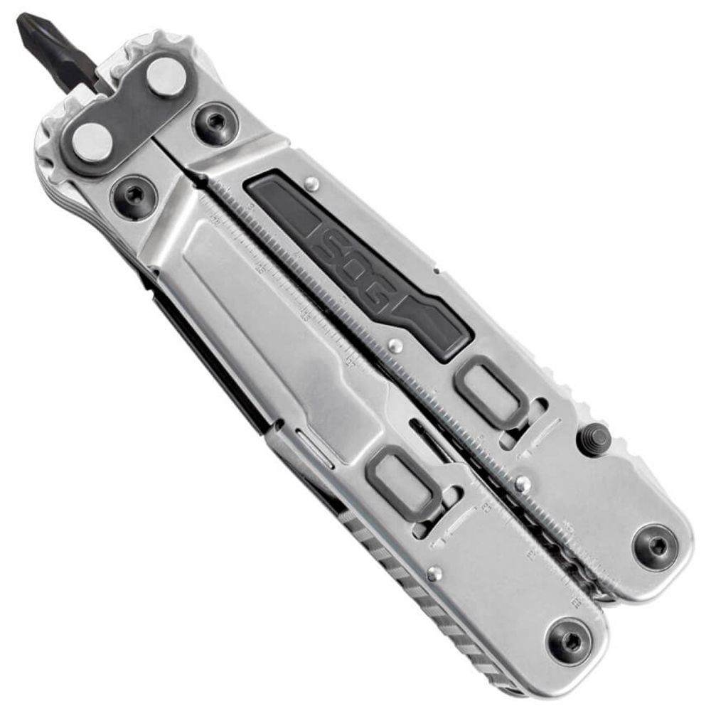 The PowerGrab is more like an every-tool than a multi-tool. The steel frame houses 19 components to tackle virtually any problem you might face on the job or in the field. The PowerGrab is driven by the SOG exclusive Compound Leverage system, which provides twice the gripping power of conventional single pivot tools. This model features a durable nylon belt sheath and 12-piece hex bit set to use with the magnetic driver. The tools included are: hex bit driver, needle nose pliers, bolt grip channel, serrated blade, straight edge blade, awl, bottle opener, can opener, 3-sided file, 3 flat screwdrivers (small, medium, large), phillips screwdriver, soft and hard wire cutters, ¼-inch driver, ruler, scissors, and wire crimpers.