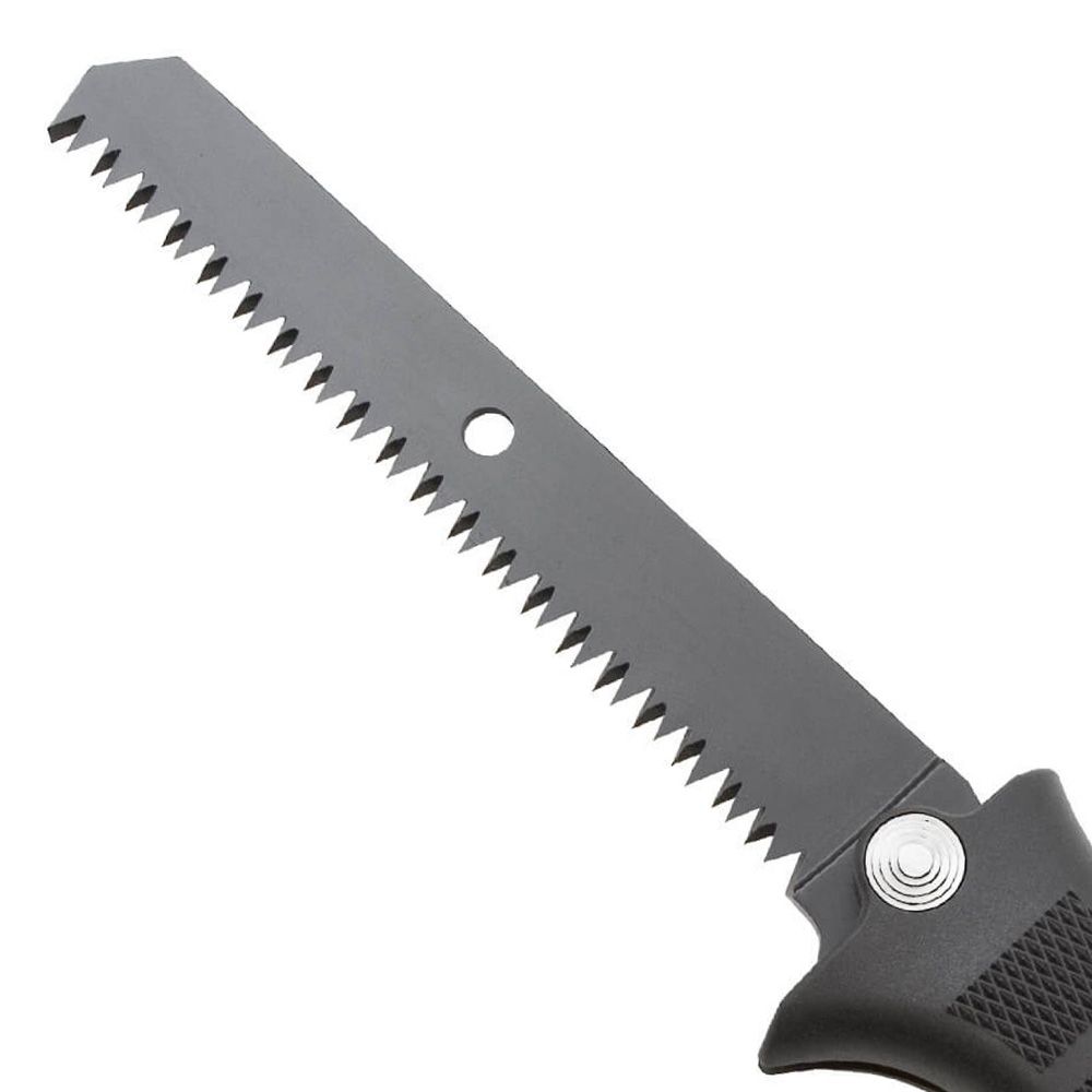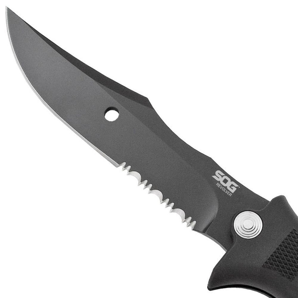 The SEAL Revolver comes standard with a new look in blade shape that is not only functional, but distinctive. A survival saw serves as a backup in the handle. The blade features a forward thumb rest for increased dexterity and downward pressure. A glass-reinforced nylon (GRN) handle hides the stainless steel liners which ensure strength and quality. And as always, SOG edges are razor sharp.