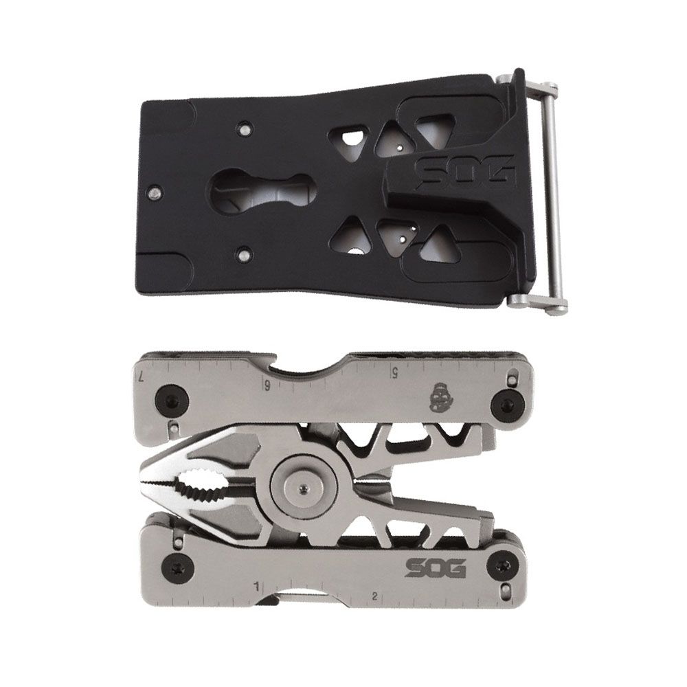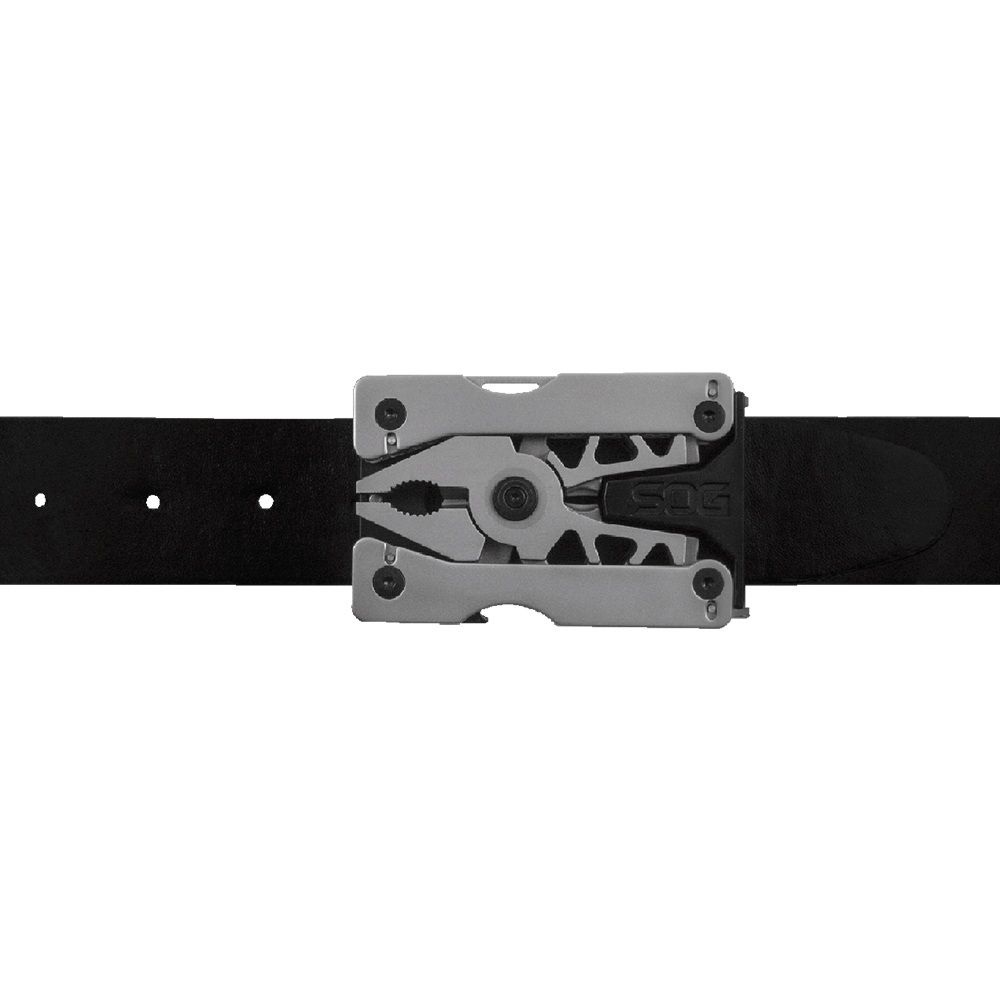 Buckle-up with the SOG Sync! This handy multi tool has an innovative clip-in base that can be attached to any surface or used as a fully functional belt buckle. The Sync 2 is a larger model of the Sync 1, designed to fit belts 1.37" - 1.75" wide. The solid steel frame houses a 2" blade, bolt/nut grippers, crimpers, a 3-sided file, a small and medium flat screwdriver, a Phillips screwdriver, a bottle opener, pliers, a ruler, scissors, and soft wire cutters. These quintessential tools can perform any task around the house, at work, or in the field—including holding your pants up!