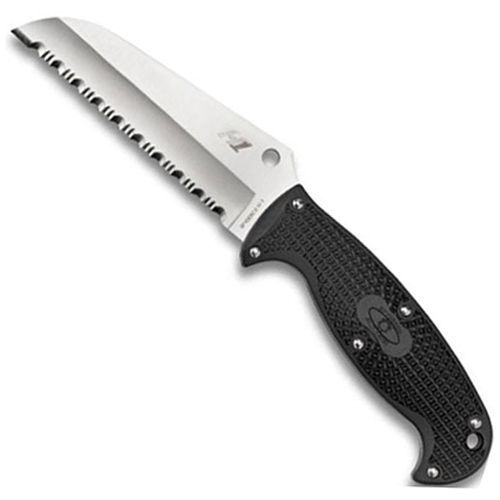 The Army's 82nd Airborne set out what they wanted in a knife and Spyderco complied by making the Spyderco Jumpmaster fixed blade. Their wish list included a rust-proof hollow-ground H-1 blade with a Sheepfoot (Rescue) profile. The blade comes fully serrated to quickly cut through ropes, lines, webbing or fabric. To keep the knife firmly in hand yet light and easily maneuverable, the handle is made of fiberglass reinforced nylon (FRN) that is Bi-Directionally Textured for a secure grip. The tang of the blade is skeletonized reducing the weight even more.