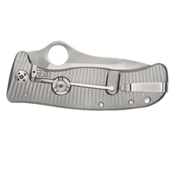 Unlike the SR-1's one-piece titanium handle, the LionSpy features a two-piece handle construction that consists of one black G-10 scale and one titanium scale. The titanium scale is precision machined from solid 6AL-4V titanium and serves as the basis of the knife's stout Reeve Integral Lock (R.I.L.) mechanism. Both scales are CNC machined with a series of grooves perpendicular to the handle's length to enhance its texture and ensure a positive grip. They also feature a refined shape that supports a wider range of grip styles and include a compact pocket clip that supports right-side, tip-up carry. This unique combination of materials and the knife's open-backed design reduce weight and simplify cleaning and maintenance.