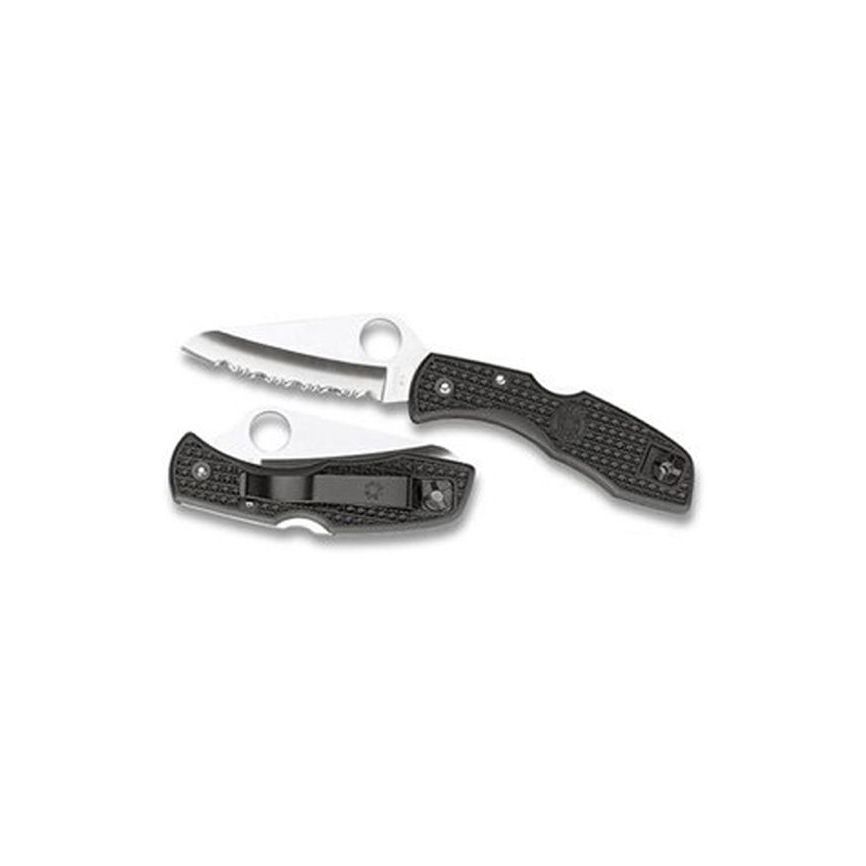 One of Spyderco's top sellers is our Delica Model. Users gravitate to it due to its sensible size, versatile shape and tested durability. It makes complete sense to plug H1 into this model, so we did, with a couple modifications. Salt I has a more rounded tip that's a bit thicker at the point. Since H1 was developed specifically for use in and around water, rounding the tip better met the requirements of cutting chores associated with boating and fishing. The Spyderco Round Hole is increased in diameter to 14mm facilitating easier access for gloved or wet hands. All inside/outside steel components (lock bar, pins and clip) have been treated making them impervious to rust and pitting. Volcano Grip texturing covers both sides of the FRN handle for friction-resistance to slipping. David Boye's locking lever dent is a standard feature that inhibits the lock from accidental release if the handle is gripped with great force. A matching black titanium pocket clip positions for left/right tip-up portability. A hole running through the hollow clip screw makes a lanyard pipe for stringing thong or cord through when using around water.