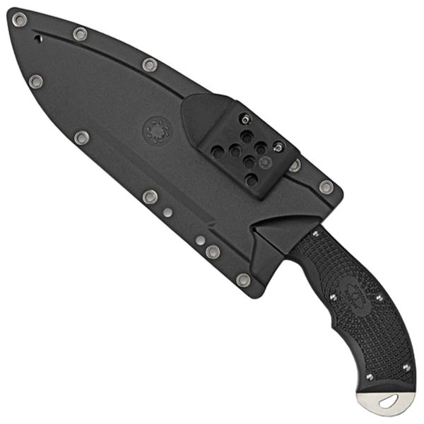 One of the most distinctive characteristics of the Schempp Rock is its unique dropped-handle design. The angle between the handle and the blade allows the user's hand to maintain a strong, natural wrist angle and lowers the blade and cutting edge in relationship to the line of the forearm. This provides enhanced control during cutting, reduces fatigue, and transfers energy more efficiently during chopping motions. The handle features full-tang construction for strength and textured, injection-molded, fiberglass-reinforced-nylon handle scales for a secure, comfortable grip.