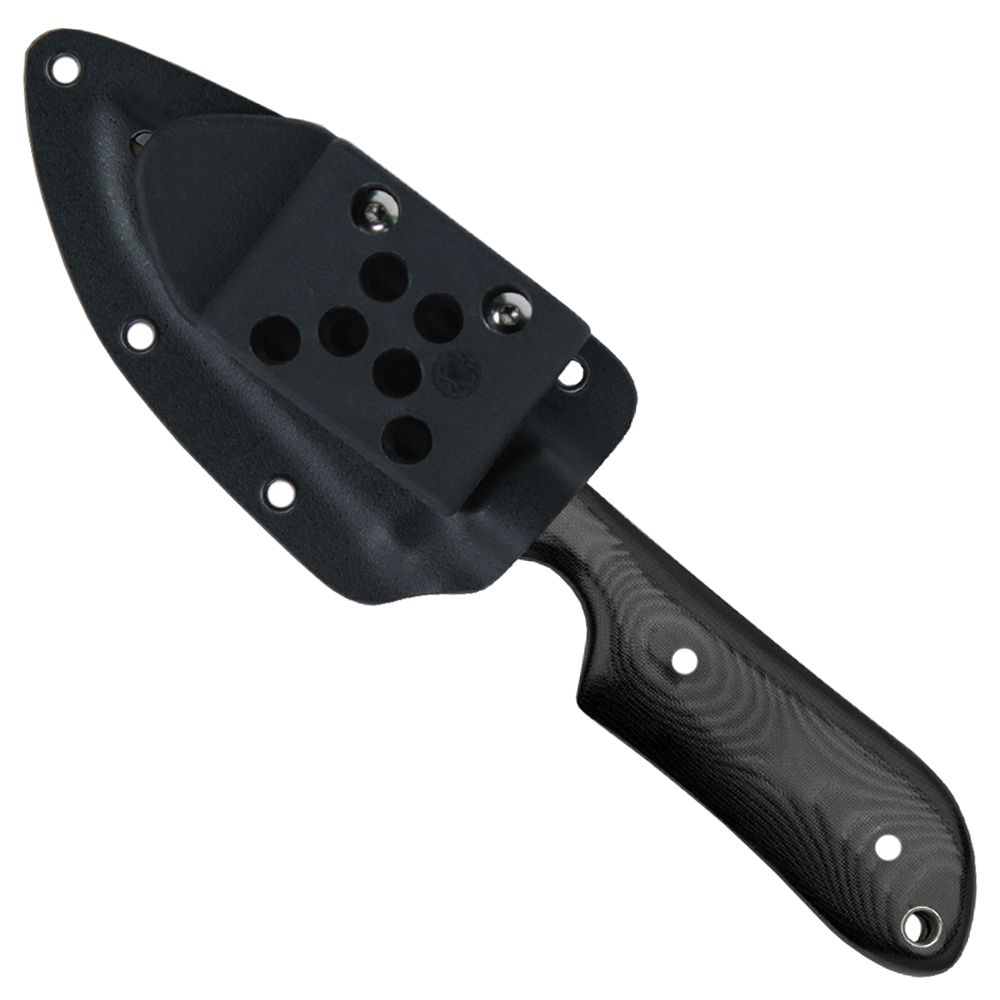 It's constructed from a full-length piece of steel set between Micarta handle scales. The scales are double pinned, expanding three-dimensionally on both ends offering the hand exceptional grip. The VG-10 clip point blade is double flat-ground with crosshatching called jimping on its spine that creates texture therefore tactile resistance against the skin of the hand and keeping the knife firmly in grip. There are two lanyard holes, a traditionally positioned handle lanyard and a small lanyard hole through the blade. Looping a thong or cord through the blade lanyard keeps your hand positioned forward on the handle even when swinging or chopping.