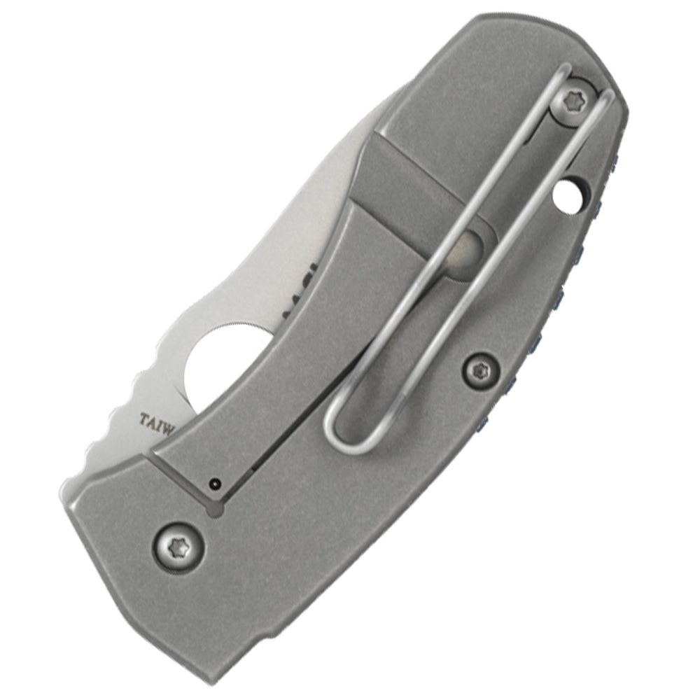 The handle is titanium with contrasting blue handle spacers leaving the handle open and exposing the inner workings for ease of cleaning. A Chris Reeve Integral Lock (R.I.L.) incorporates the handle's back scale as the lock. With the handle's back side doubling as both handle and lock, the need for internal liners is dispensed with, and the knife can be manufactured lighter and slimmer while retaining greater strength. A deep pocket wire clip can be positioned for left-hand or right- hand use with the blade tip positioned with the tip upward in the pocket.