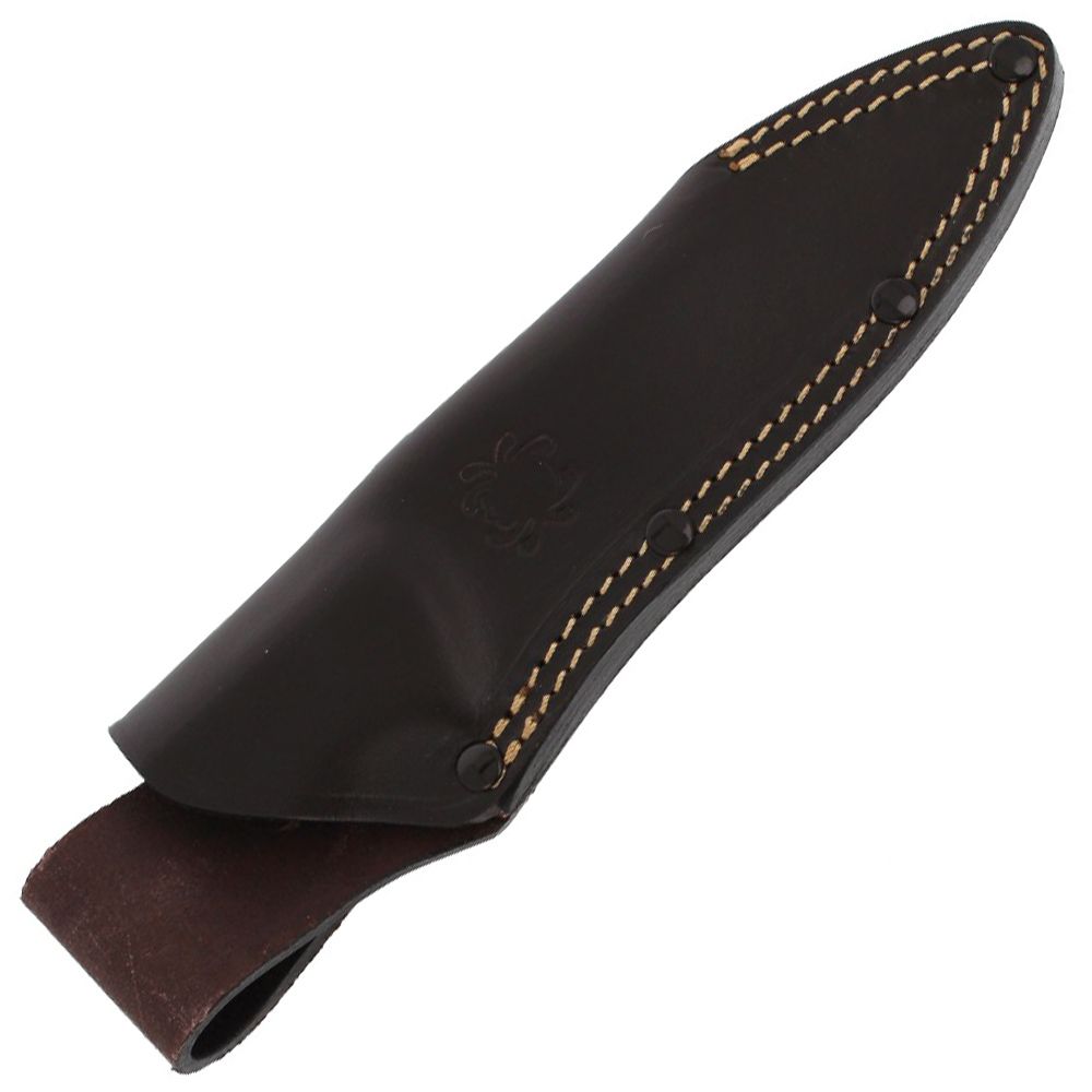 The cocktail of distinctive blade shape, superior steel with a full flat grind, work in concert to create a knife that will stand up to harsh use and remain reliable. The handle is bead-blasted mocha colored canvas Micarta-contour milled into a three dimensional handful of gripping options. Inside, a skeletonized tang runs the full length of the handle. The Temperance 2 is accompanied by a handsome leather sheath that provides safe, secure carry.