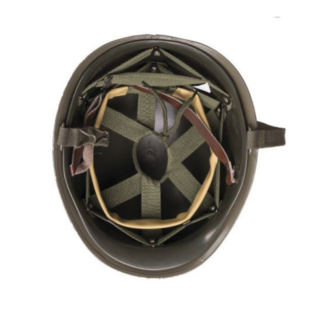 An Austrian Bundesheer variation of the iconic US M1 helmet. Helmets of this design were used from WWII through to the late '80's by many NATO countries. These Austrian steel pots are dated from 1970-80 and include a liner. The shell retains the typical M1 shape with a steel construction, painted in olive drab. Austrian M1 liners differ slightly, featuring a tongued leather pad with two wide canvas suspension straps underneath. A must-have for a military headwear collection or reenactments.