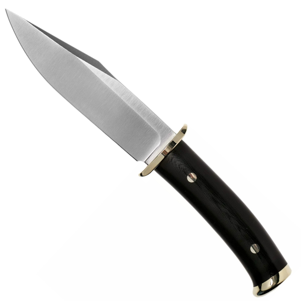 In addition to having a great name, the Teton Tickler is a good knife. This knife feels like a high-end outdoorsman's tool. It is a play on the Tennessee Tickler by TOPS Knives and is named for the renowned mountain region in northwest Wyoming. It is made to withstand everything and keep working, starting with the sweeping Bowie blade, which measures just under five and a half inches and is made of sturdy D2 blade stock. To complete the design, polished black G10 scales with finely sculpted edges are enclosed by a guard and pommel made of nickel silver. Over a normal grip, we definitely like its natural-looking curvature. The attached belt sheath is made of black leather and has a vintage appearance while being incredibly useful and well-made. The