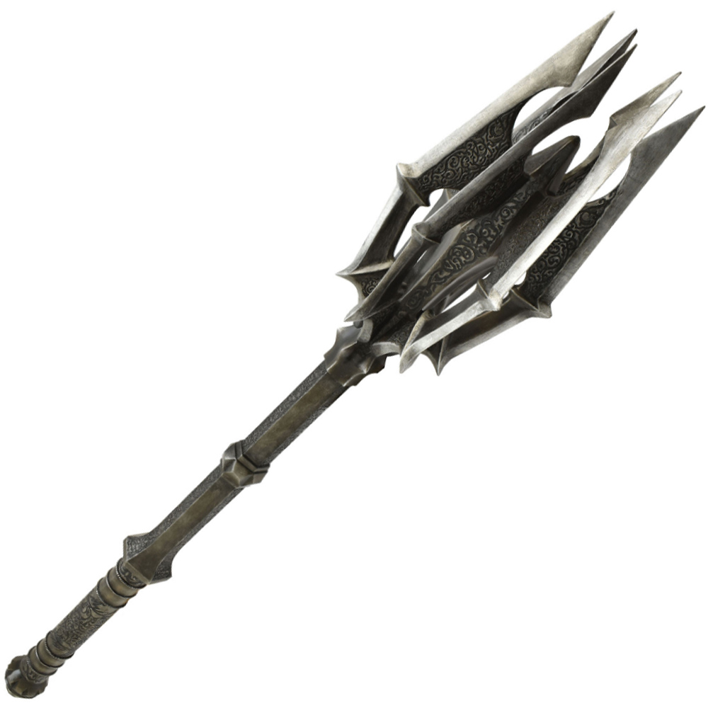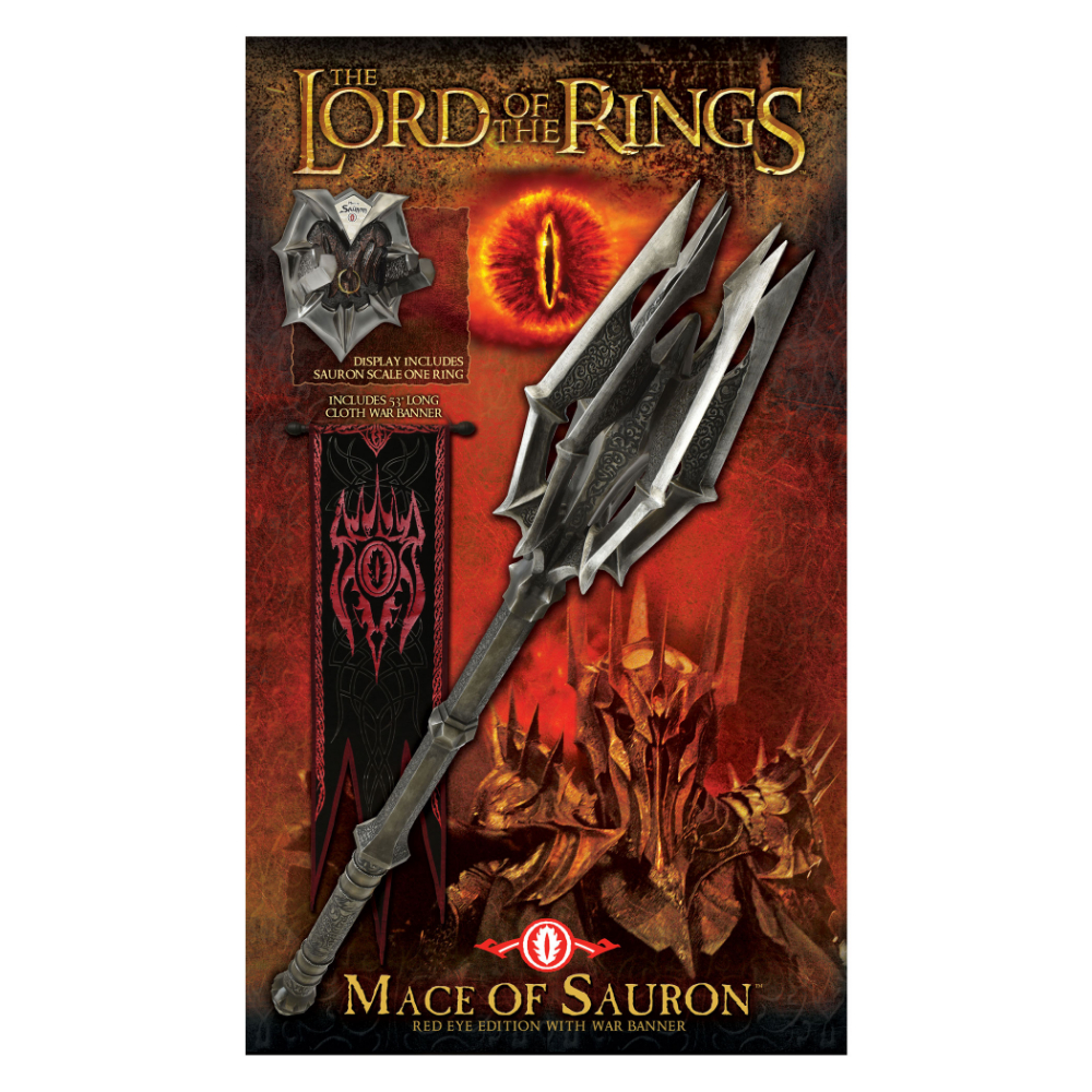 A replica of the massive mace wielded by the Dark Lord Sauron in the prologue of The Lord of the Rings: The Fellowship of the Ring. When Sauron's forces battled the Last Alliance of Elves and Men on the slopes of Mount Doom, Sauron emerged on the battlefield wearing blackened steel armor. In one iron gauntlet he held a massive six-bladed, black iron war mace. On one finger he wore the source of his power, The One Ring. With every swing of this terrible weapon Sauron crushed his foes, sending intimidation and fear throughout the ranks of all who would stand against him.