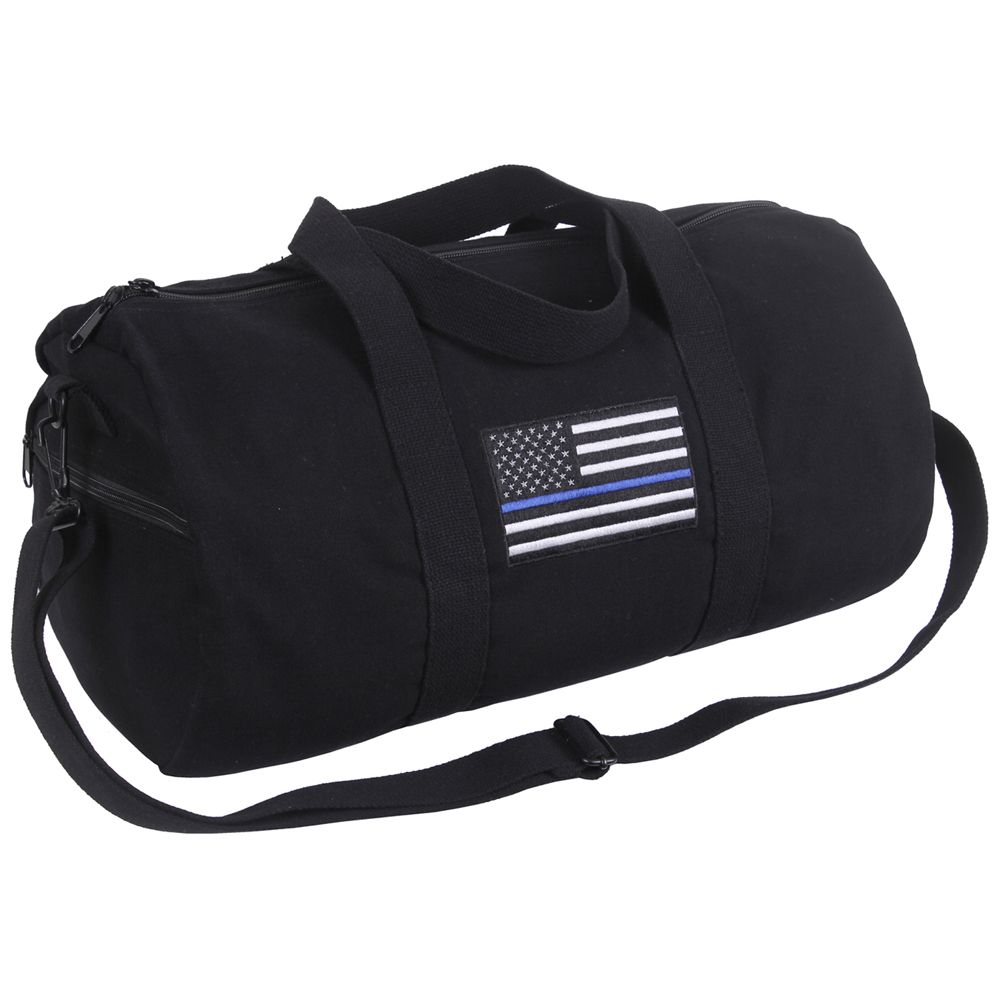 Thin Blue Line Canvas Shoulder Duffle Bag is the perfect bag for traveling or the gym while supporting Police Officers and Law Enforcement Officials. The 19" x 9" duffle bag is made of a heavyweight cotton canvas, with a detachable and adjustable shoulder strap as well as twin carry-on handles. On one side of the canvas shoulder back is an embroidered Thin Blue Line US Flag. There is also a zippered pocket at the end of the bag.