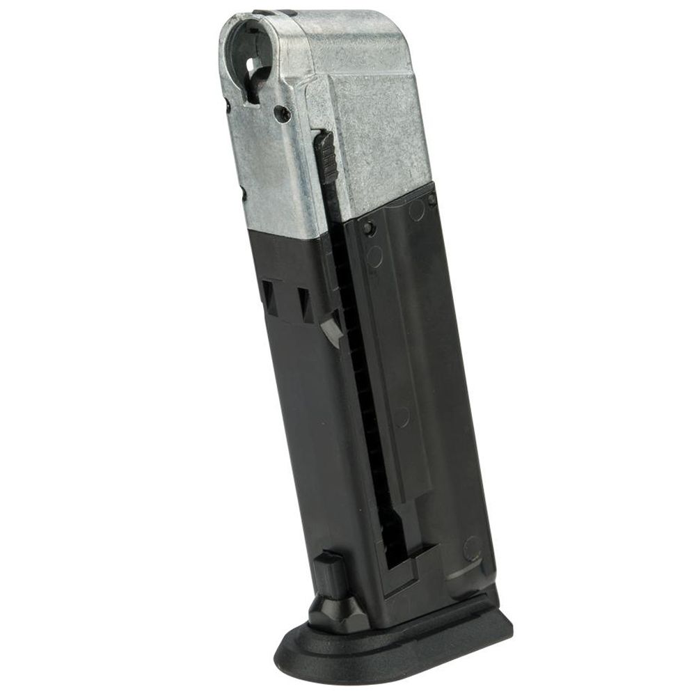 Stay in control on the paintball field with this spare magazine for the Umarex Walther PPQ M2 T4E .43 Paintball Pistol. Built with the same high quality metal frame as the gun, it comes with an interchangeable spring to handle different ammo weights. The Walther engraved base plate slides out to provide access to the CO2 compartment and spring track.