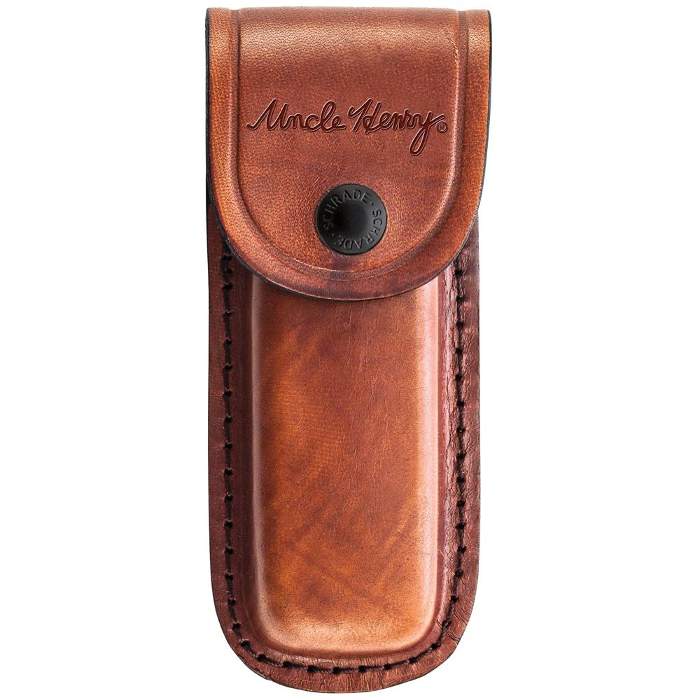 Uncle Henry Bear Paw Lockback Folding Pocket Knife, 7Cr17 High Carbon Stainless Steel Clip Point Blade with Nail Pull, Wood Handles with Brass Bolsters, Brass Pins, Heat Treated Back Springs, and Brown Leather Belt Sheath.