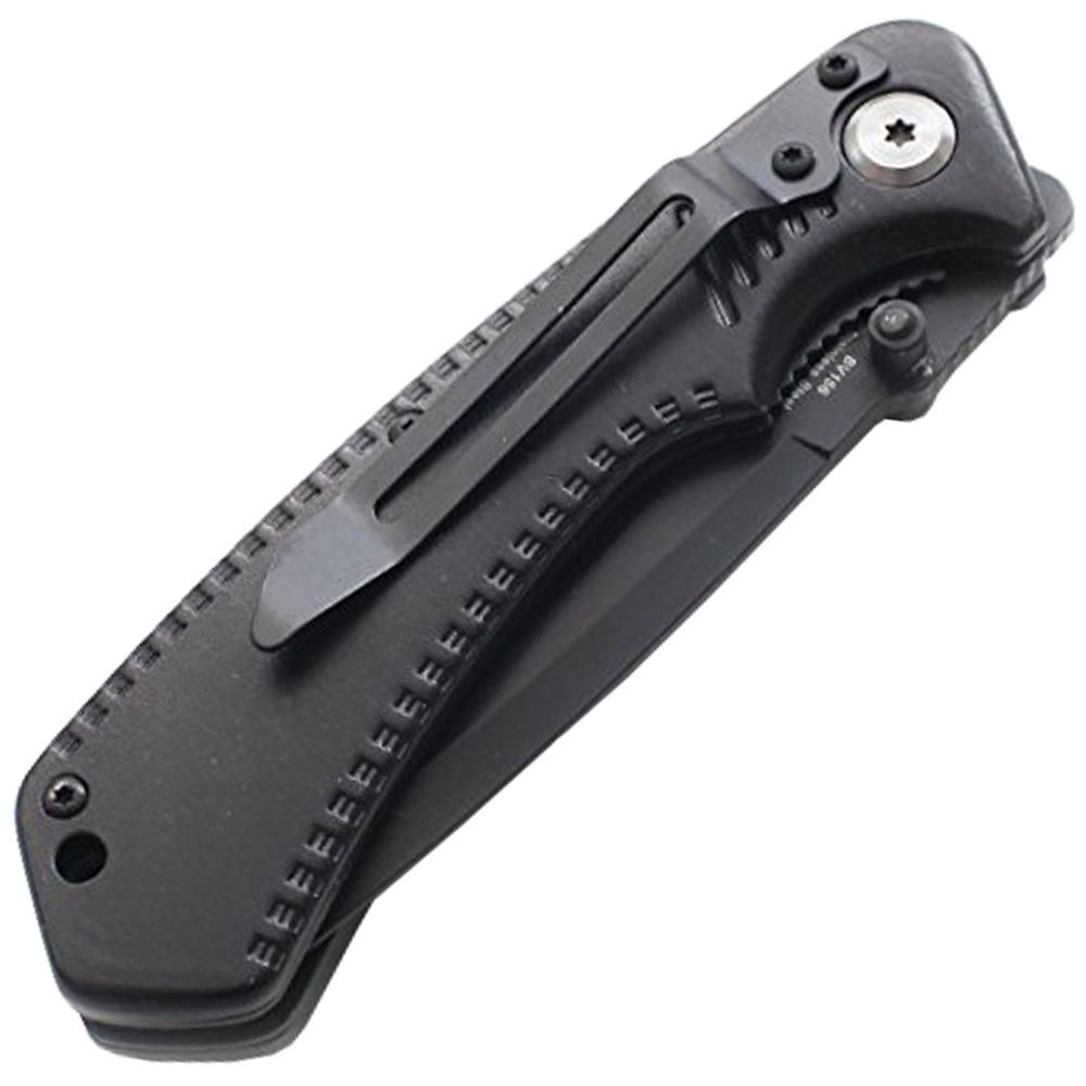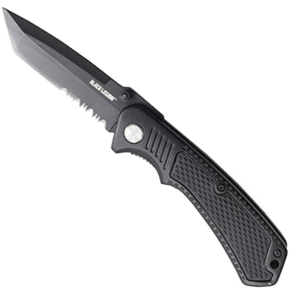 This assisted-open Cyclone tanto folder from Black Legion features a 3 1/2" black-coated, razor-sharp stainless steel blade with partial serrations that opens with lightning speed. Aluminum handle scales offer a checkered pattern for an excellent grip. A strong, metal pocket clip holds it tightly in place in your pocket or pack. 4 1/2" cl, 8 3/4" overall.