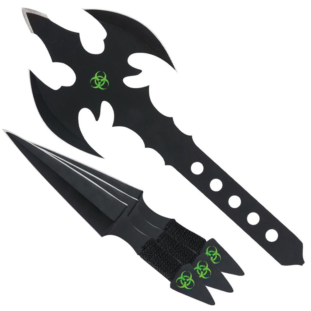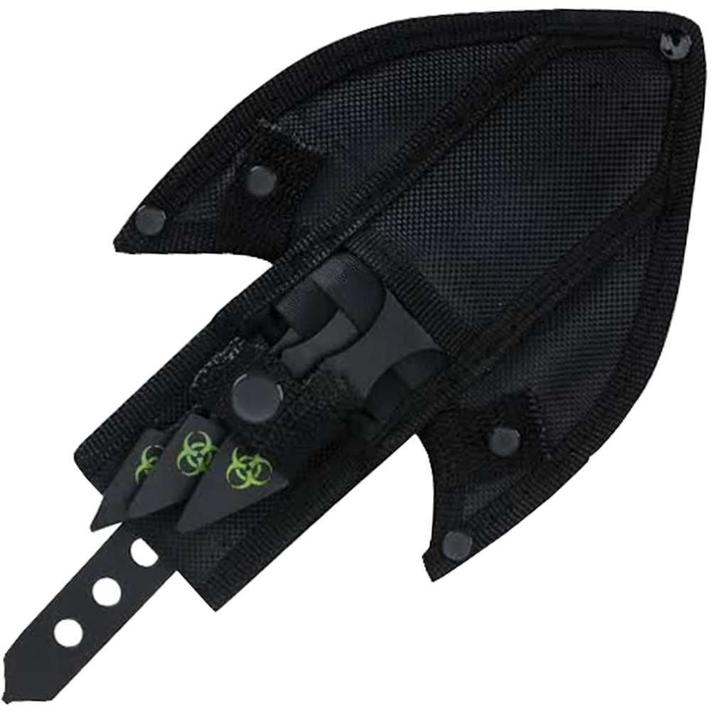 Prepare for the pending zombie apocalypse with this awesome new throwing knife set from Black Legion. This set includes a 8 1/2" triple sided throwing axe and three separate 6 1/2" throwing knives. Each thrower is constructed of one solid piece of AUS-6 stainless steel and is black coated for corrosion resistance. A toxic green biohazard symbol has been added to each blade. Includes a nylon sheath which stores all four blades.