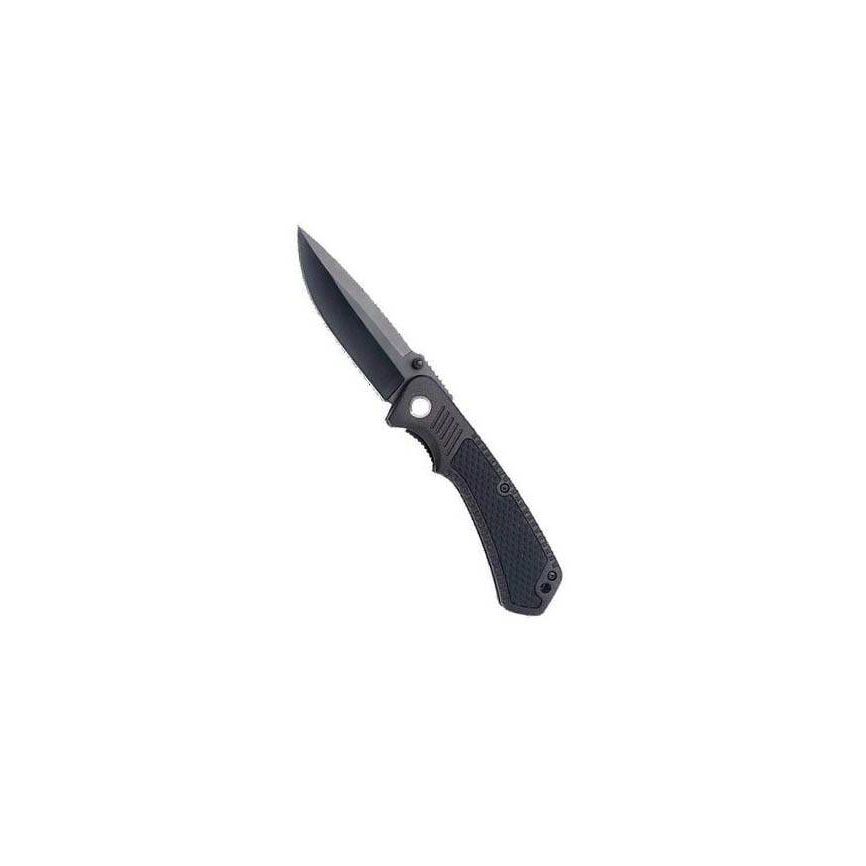 This assisted opening folding knife features a black finish stainless steel 3 1/2" drop point blade with thumb stud. This folder incorporates assisted opening blade technology to quickly deploy the blade into action once the blade has been initially opene