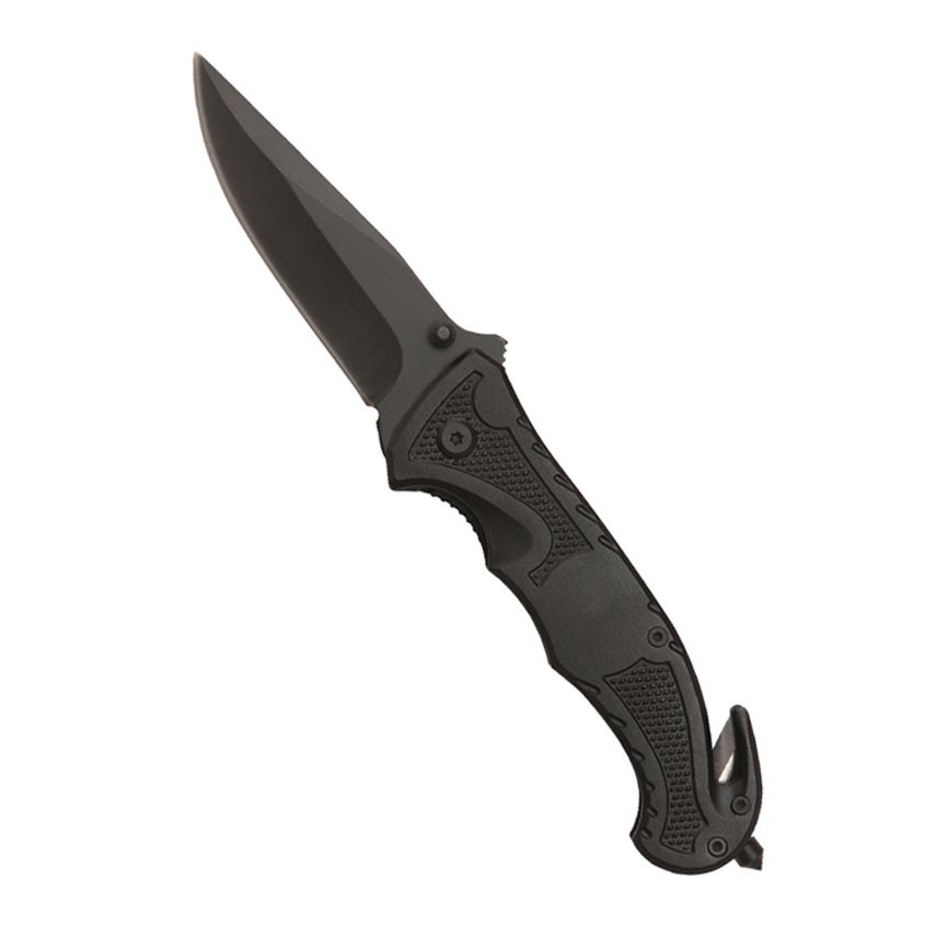 The assisted-open rescue folder features a 3 1/2” anodized stainless steel blade that rockets open with just a nudge of the thumb stud using its patented assisted-open mechanism. The checkered black handle features a seat-belt cutter, glass breaker spike and ambidextrous thumb studs. The unmarked interior portion is great for laser engraving company logos and promotionals.