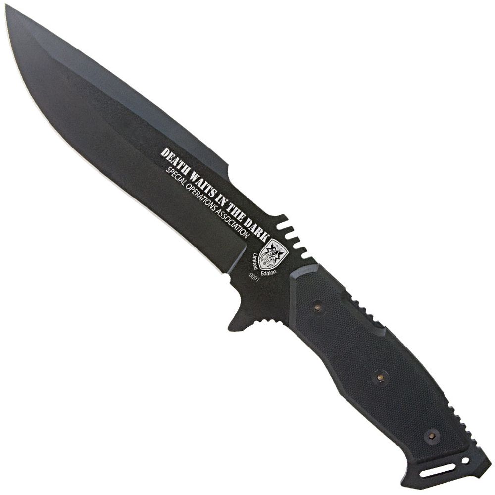 Enemies of the free world have found that "Death Waits In The Dark" when the Special Operations soldiers come knocking. United Cutlery has now designed a knife after the slogan. This limited edition S.O.A. fighting knife features a full-tang 7" stainless steel blade with an anti-corrosion, baked-on black finish. A pry-bar and flathead screwdriver are built into the pommel and a rugged black G10 handle will keep this knife gripped firmly in your hand at all times. Includes high-quality nylon belt sheath. 11 3/4" overall.