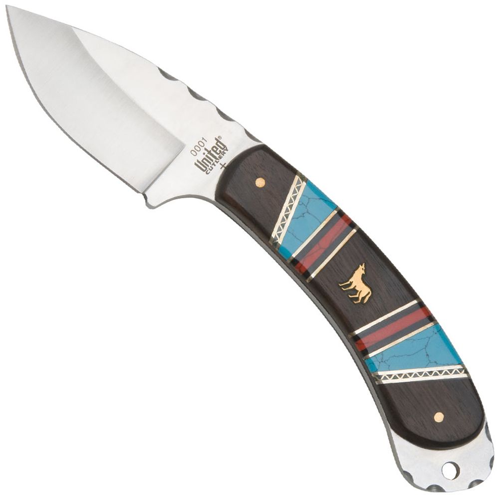 Each Frontier Collection Howling Wolf Skinner has been hand-crafted with scrupulous details offering authentic Southwestern accents. Elegant hardwood and turquoise handle scales are accented by polished brass inlays, bolsters and howling wolf shield. Intricately file-worked details have been added by crafted artisans to reflect the decor of the frontier period of the Old West. The 3.5" blade of 440 stainless steel has been honed to a razor’s edge and then individually laser-serialized using advanced blade etching techniques. Each knife is built with the quality and craftsmanship by United Cutlery, so it is not only a cutlery tool – but also a collectible. Includes leather sheath. 7.5" overall