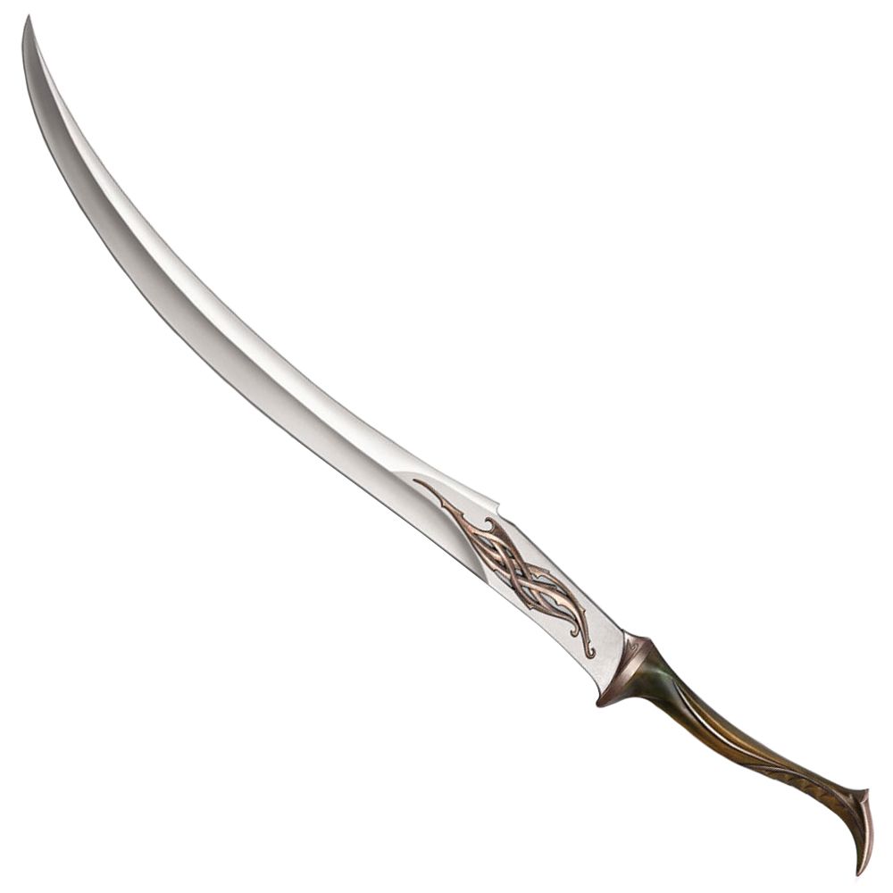 The Mirkwood Infantry are soldiers of Woodland Guard, Silvan Elves sworn to protect and watch over the great forest of Mirkwood, Thranduil's kingdom. They are lethal fighters and experts in the use of various weapons including the bow and sword. The Mirkwood Infantry Sword is an elegant and deadly Silvan design, crafted with a two handed grip and Elven blade forged of Silvan steel, ornately decorated with flowing Elven designs. This United Cutlery collectible replica features bronze finished cast metal hilt parts, a composite grip, and stainless steel blade with cast metal ornaments. It is presented with a wooden wall display (mounting hardware and instructions included) featuring a Wood Elf graphic motif, and includes a certificate of authenticity.