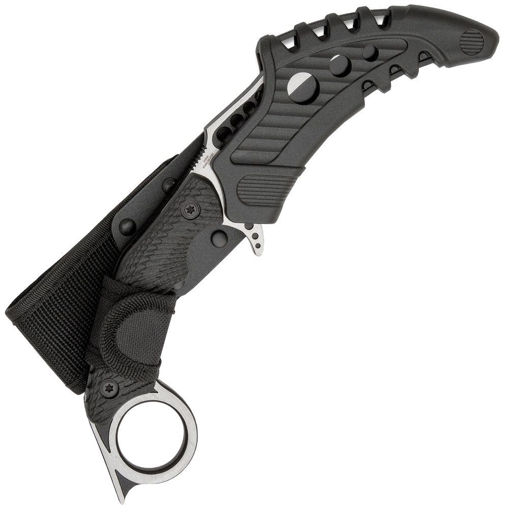 From the new Liberator series, United Cutlery’s M48 Falcon Karambit Knife is another triumph of tried and true ancient design reimagined into a modern, tactical weapon. It has a 4 5/8” 2Cr13 stainless steel blade with a black oxide coating and satin finish accents, plus, weight-reducing thru-holes. The ergonomic, grippy handle has injection molded nylon handle scales, secured to the full-tang with heavy-duty screws. The traditional open-ring pommel has a point on it to use as a second line of law enforcement against an assailant. The 10” overall karambit knife can be carried and stored in an injection molded TPU and nylon belt sheath.