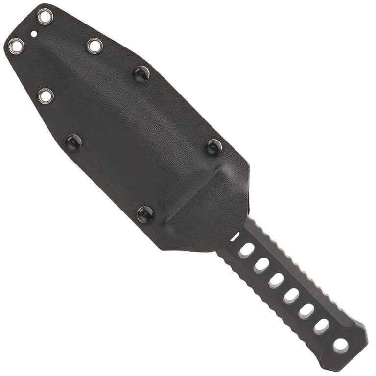 The M48 Black Combat Dagger comes in at a compact 8 3/4” in overall length, allowing you to carry it discreetly and use it effortlessly. It has a solid, CNC machined, one-piece D2 tool steel construction with a ridged and perforated handle, making it grippy. The fixed blade knife has a keenly sharp, double-edged dagger blade with a black finish and a blood groove. The combat dagger snaps securely into a Kydex sheath that has a sturdy metal belt clip and stainless steel lashing holes.