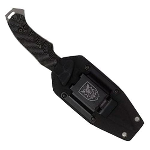 This S.O.A. Assault knife features a contoured premium Micarta handle which not only gives this knife a tactical appearance, but is also slip resistant and extremely easy to grip even while wet. The 4 3/4” full-tang blade has been titanium-coated to reduce glare and prevent corrosion and then etched with the S.O.A. emblem and “Death Waits In The Dark.” The extended tang of the blade can be used as a pry bar in emergency situations. Each knife includes a custom-molded Kydex sheath with a high-pressure metal clip that has been laser-etched with the S.O.A. emblem and also offers pre-drilled lanyard holes. Because the sheath is custom-molded, it prevents the knife from falling from the sheath, even while clipped upside down on a shoulder strap or rifle sling.