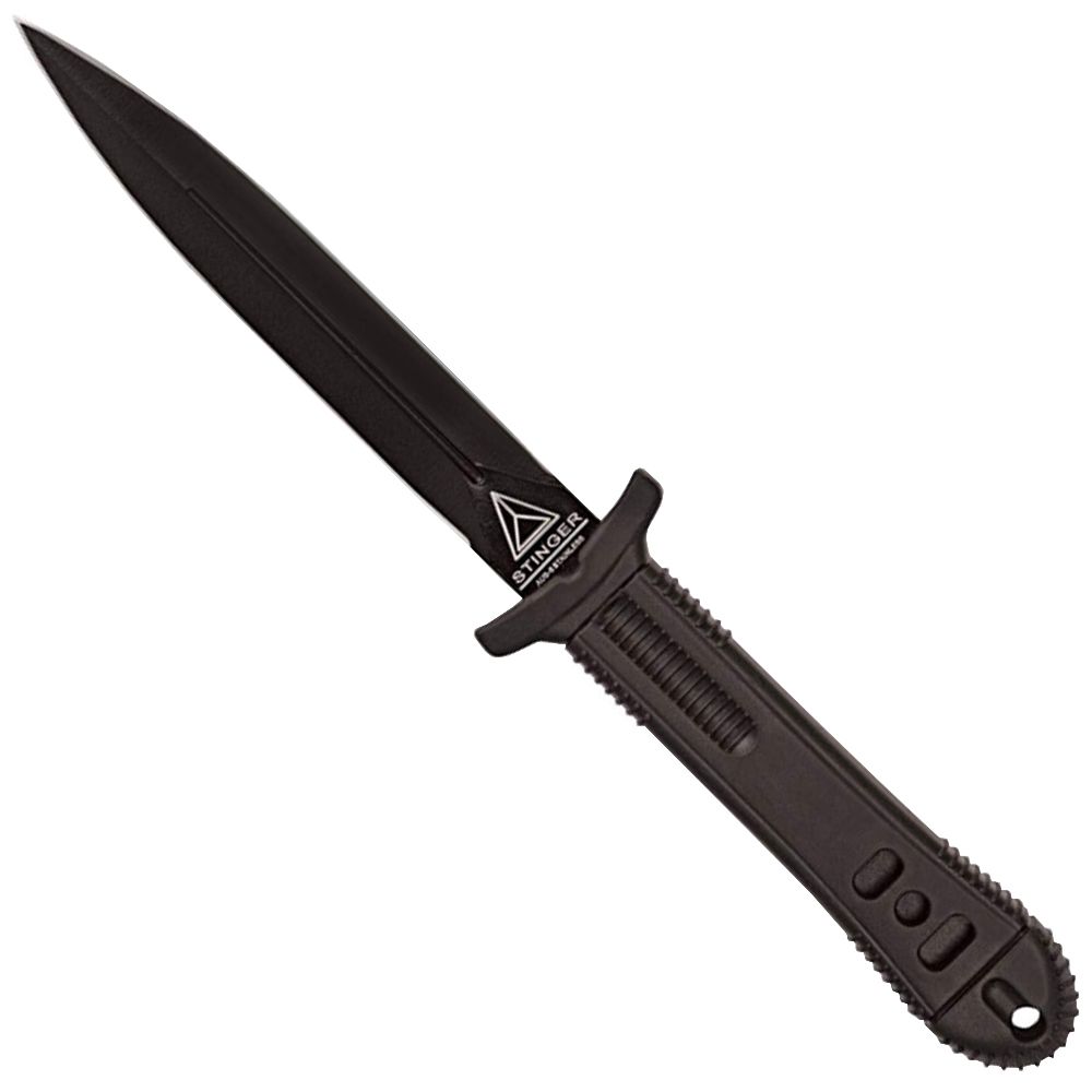Designed for high impact combat, this stinger dagger is equipped with a black-coated AUS-6 stainless steel blade and a black Santoprene handle. Includes an impact resistant sheath with quick release stud and pocket clip.
