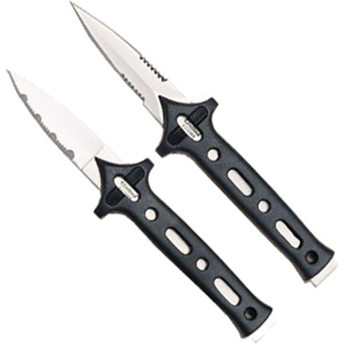 Special Agent Stinger knives in a handy belt sheath. Strap the sheath over your belt and you can reach back and grab either of 2 knives- one with a single serrated edge and the other a double edged dagger. 420 stainless steel blades with black rubber handles with encapsulated tang construction
