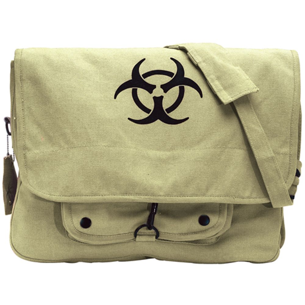 Ultra force Vintage Canvas Bag features "Bio-Hazard" symbol on front flap, 3 Inner Compartments, 1 Outer Compartment with Snaps, Adjustable Shoulder Straps and measures 15" x 11" x 4".